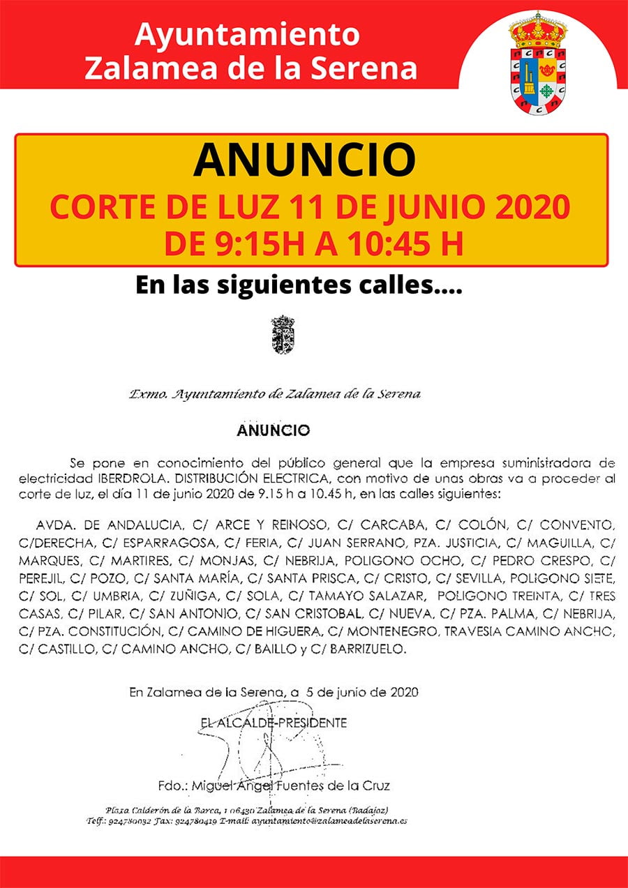 Corte de Luz día 11 de junio 2020 de 9:15 h a 10:45 h en las calles siguientes: