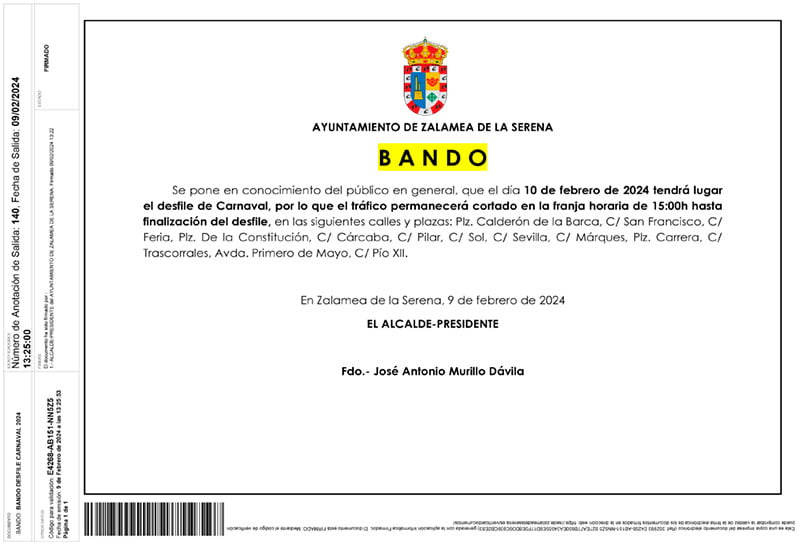 Con motivo de la celebración del desfile de Carnaval que tendrá lugar este sábado 10 de febrero de 2024, se indican las calles cuyo tráfico permanecerá cortado en la franja horaria de 15:00 horas hasta finalización del desfile.