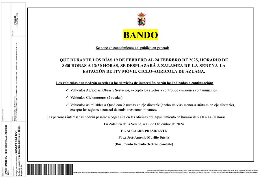 BANDO La estación móvil de ITV ciclo- agrícola de Azuaga se desplazará a Zalamea de la Serena del 19 al 24 de febrero de 2025.