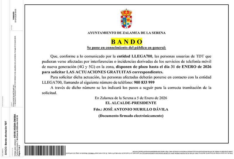 Que, conforme a lo comunicado por la entidad LLEGA700, las personas usuarias de TDT que pudieran verse afectadas por interferencias o incidencias derivadas de los servicios de telefonía móvil de nueva generación (4G y 5G) en la zona, disponen de plazo hasta el día 31 de ENERO de 2026 para solicitar LAS ACTUACIONES GRATUITAS correspondientes.
