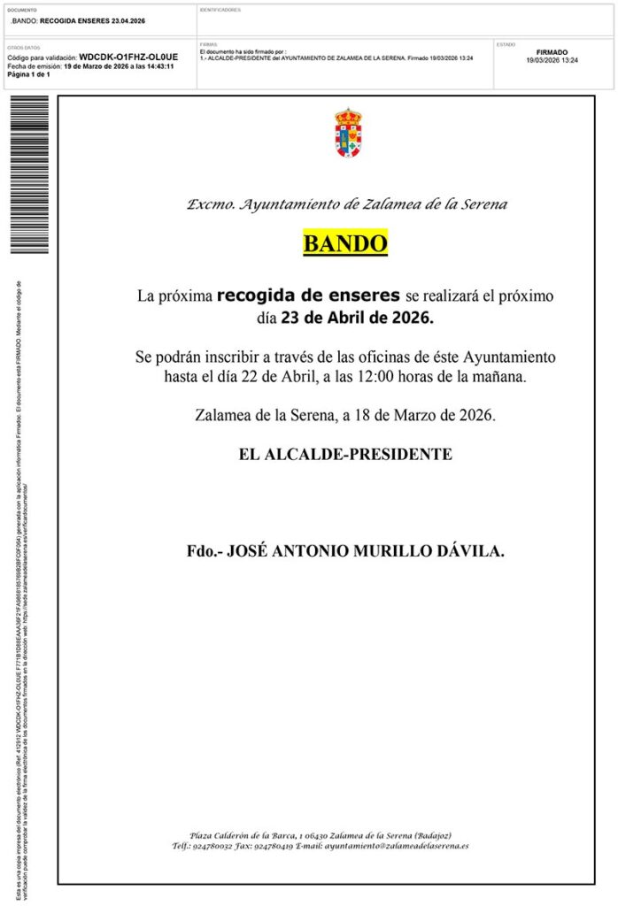BANDO RECOGIDA DE ENSERES PARA EL MES DE ABRIL 2026
