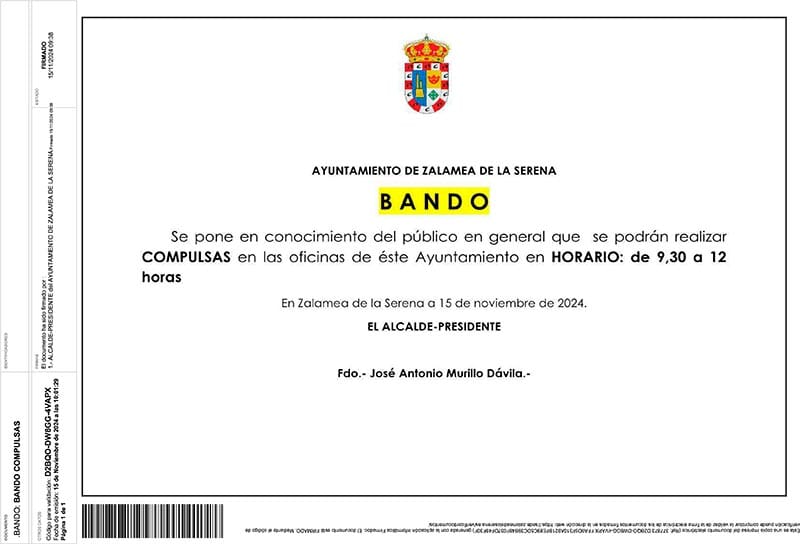 Se pone en conocimiento del público en general que se podrán realizar COMPULSAS en las oficinas del Ayuntamiento de Zalamea de la Serena en HORARIO: de 9:30h a 12 h
