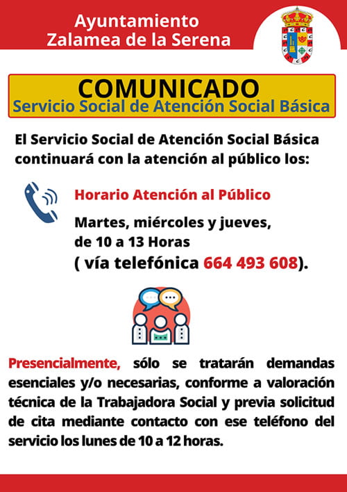 El Servicio Social de Atención Social Básica continuará con la atención al público los martes, miércoles y jueves, de 10 a 13 Horas