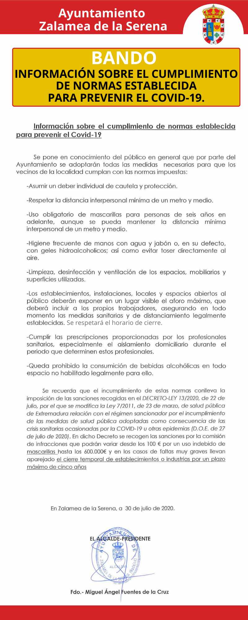 INFORMACIÓN SOBRE EL CUMPLIMIENTO DE NORMAS ESTABLECIDA PARA PREVENIR EL COVID-19.