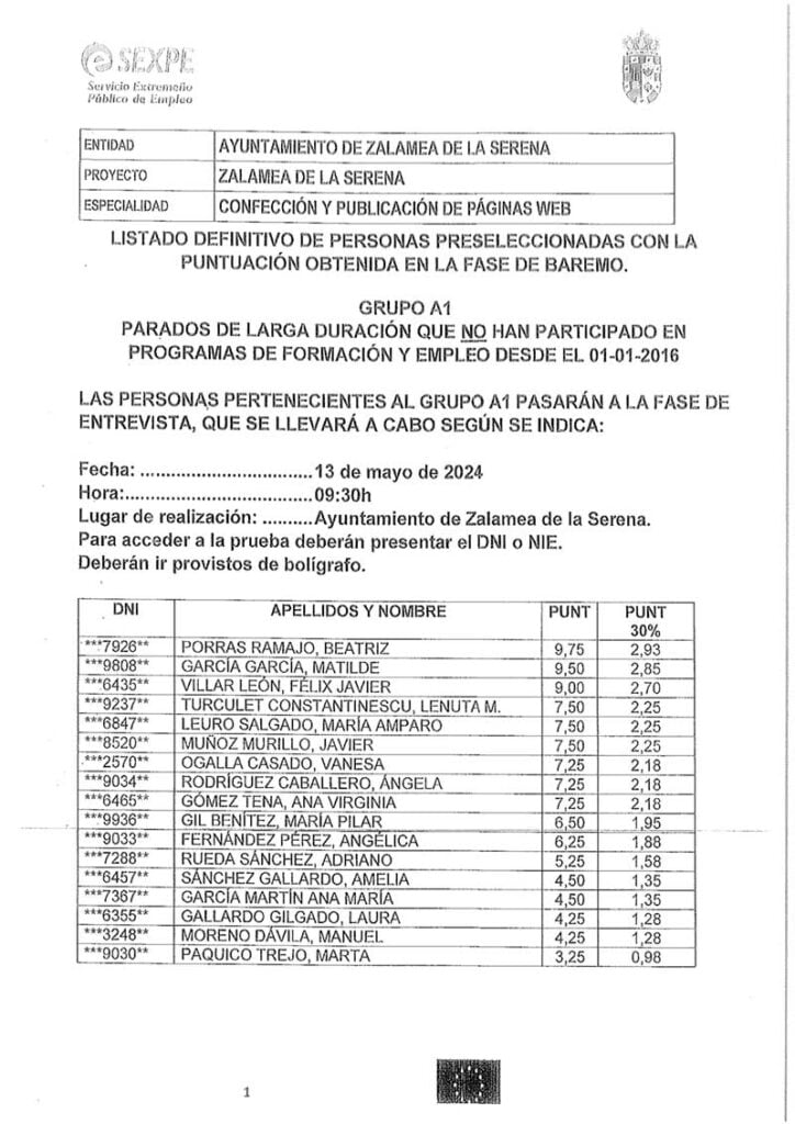 Listado definitivo de personas preseleccionadas con la puntuación obtenida en la fase de baremo e información sobre el lugar y fecha en la que tendrá lugar la fase de entrevista.
