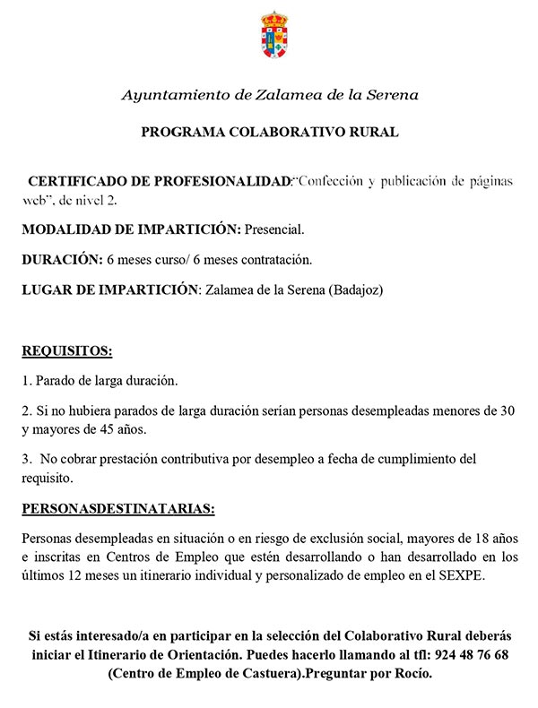 Más información: Centro de Empleo de Castuera – Tel. 924 48 76 68 (preguntar por Rocío).