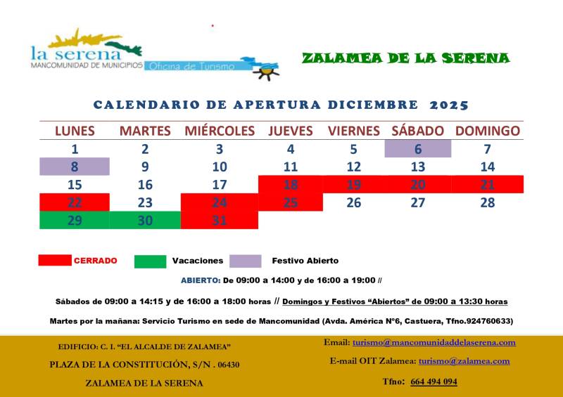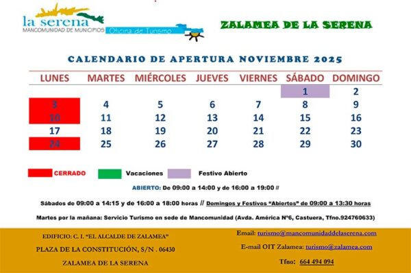 La oficina de turismo de Zalamea de la Serena dispone de cara al visitante de información turística de toda Extremadura. En sus instalaciones podrá obtener información acerca del servicio de visitas guiadas.