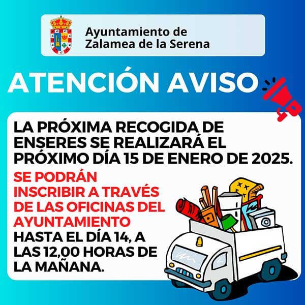 La próxima recogida de enseres se realizará el próximo día 15 de ENERO de 2025.